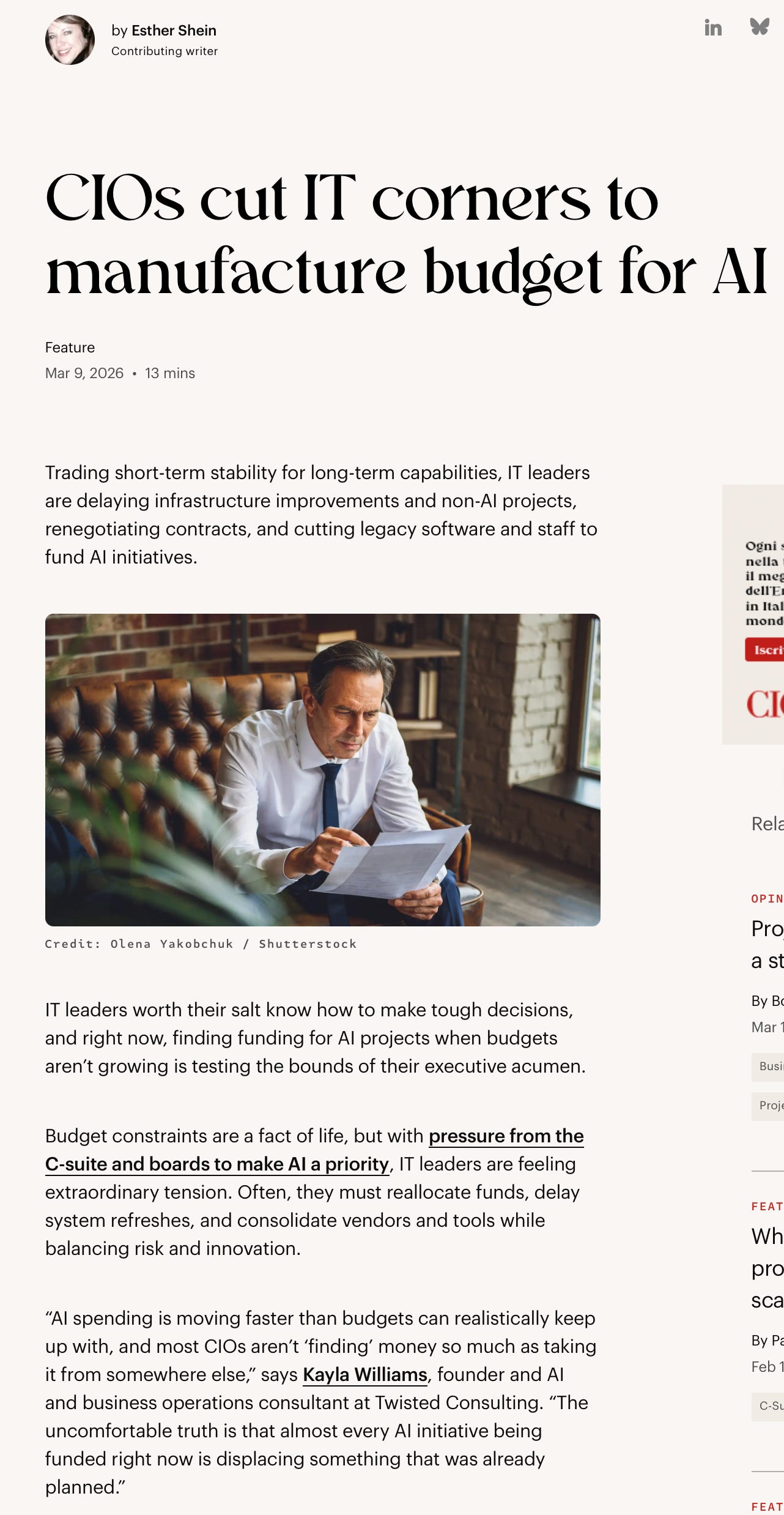 La seconda è un commento su CIO.com secondo cui i CIO stanno tagliando i budget per far posto agli investimenti in AI: “CIOs cut IT corners to manufacture budget for AI”. E ancora: “AI spending is moving faster than budgets can realistically keep up with, and most CIOs aren’t ‘finding’ money so much as taking it from somewhere else.”