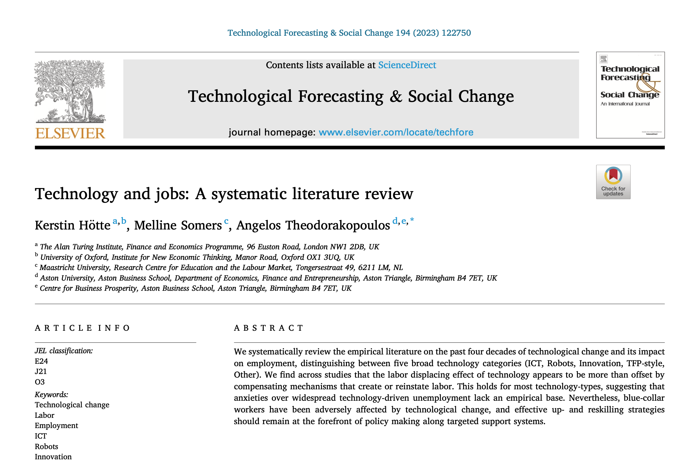 We systematically review the empirical literature on the past four decades of technological change and its impact on employment, distinguishing between five broad technology categories (ICT, Robots, Innovation, TFP-style, Other). We find across studies that the labor displacing effect of technology appears to be more than offset by compensating mechanisms that create or reinstate labor. This holds for most technology-types, suggesting that anxieties over widespread technology-driven unemployment lack an empirical base. Nevertheless, blue-collar workers have been adversely affected by technological change, and effective up- and reskilling strategies should remain at the forefront of policy making along targeted support systems.