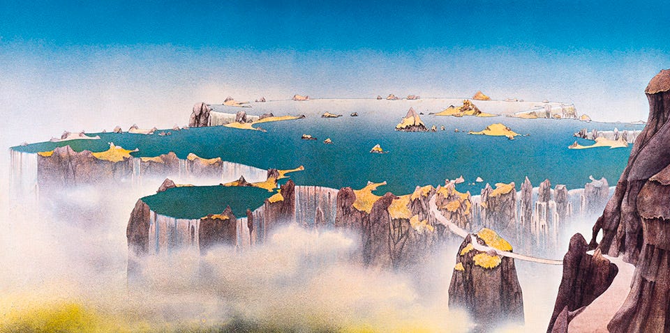 Roger Dean, l’incredibile artista che ha definito la cifra stilistica del prog, disegnò una copertina perfettamente in sintonia con questa visione. All’esterno, un’immagine sfumata: un verde smeraldo sfuggente, con il celeberrimo Yes bubble logo, introdotto proprio con questo album. E poi, la sorpresa: aprendo la copertina, compare un paesaggio incredibile e sognante. Un oceano sospeso, come nel vuoto, “close to the edge”. Come la nostra vita, alla fine. Esiste un’“edge” insuperabile: la morte. O, se vogliamo essere più positivi, la soglia dell’illuminazione.