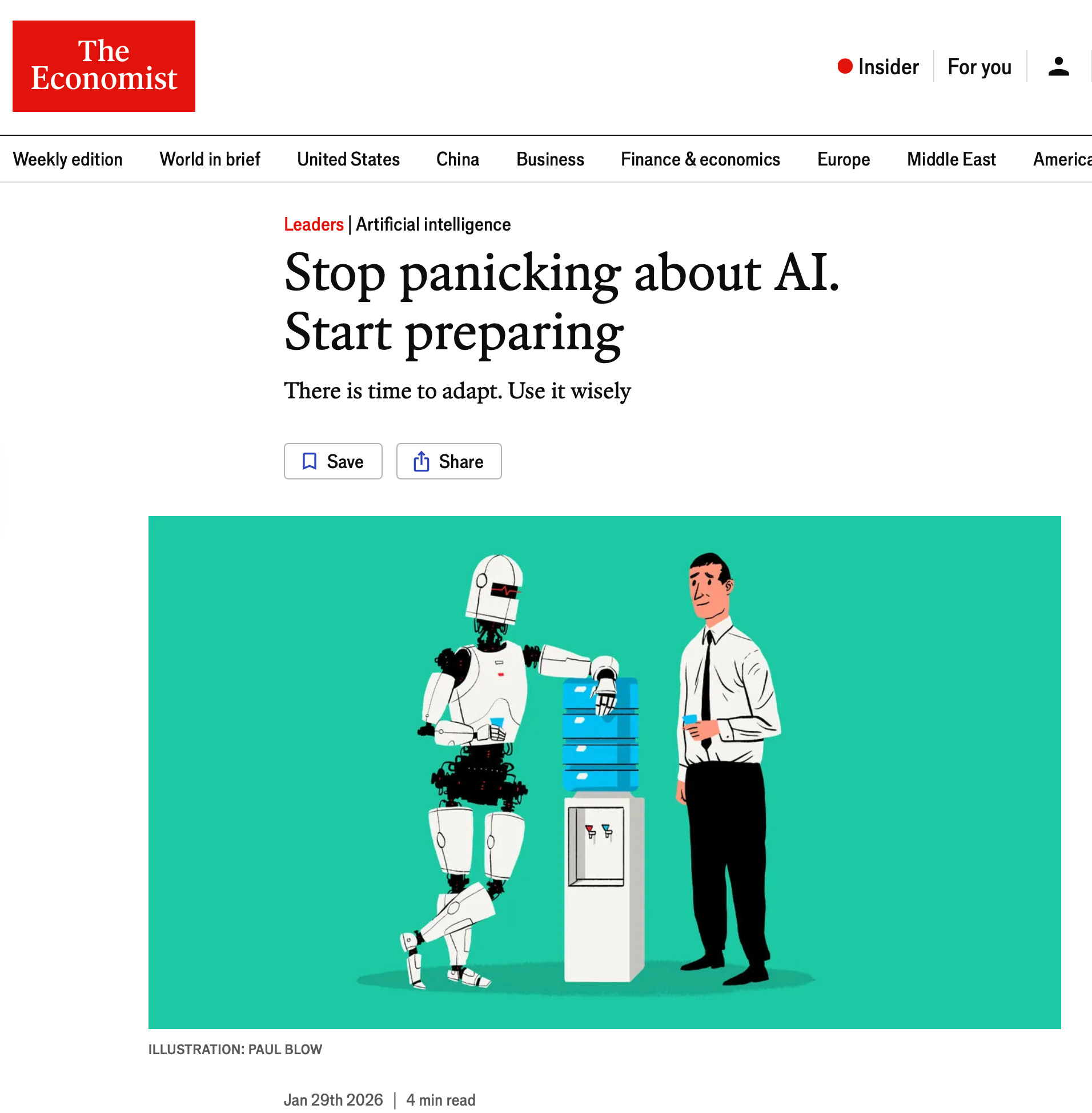 Un articolo del 29 gennaio di The Economist, anch’esso dal titolo emblematico (“Stop panicking about AI. Start preparing”) sottolinea un fatto importante: