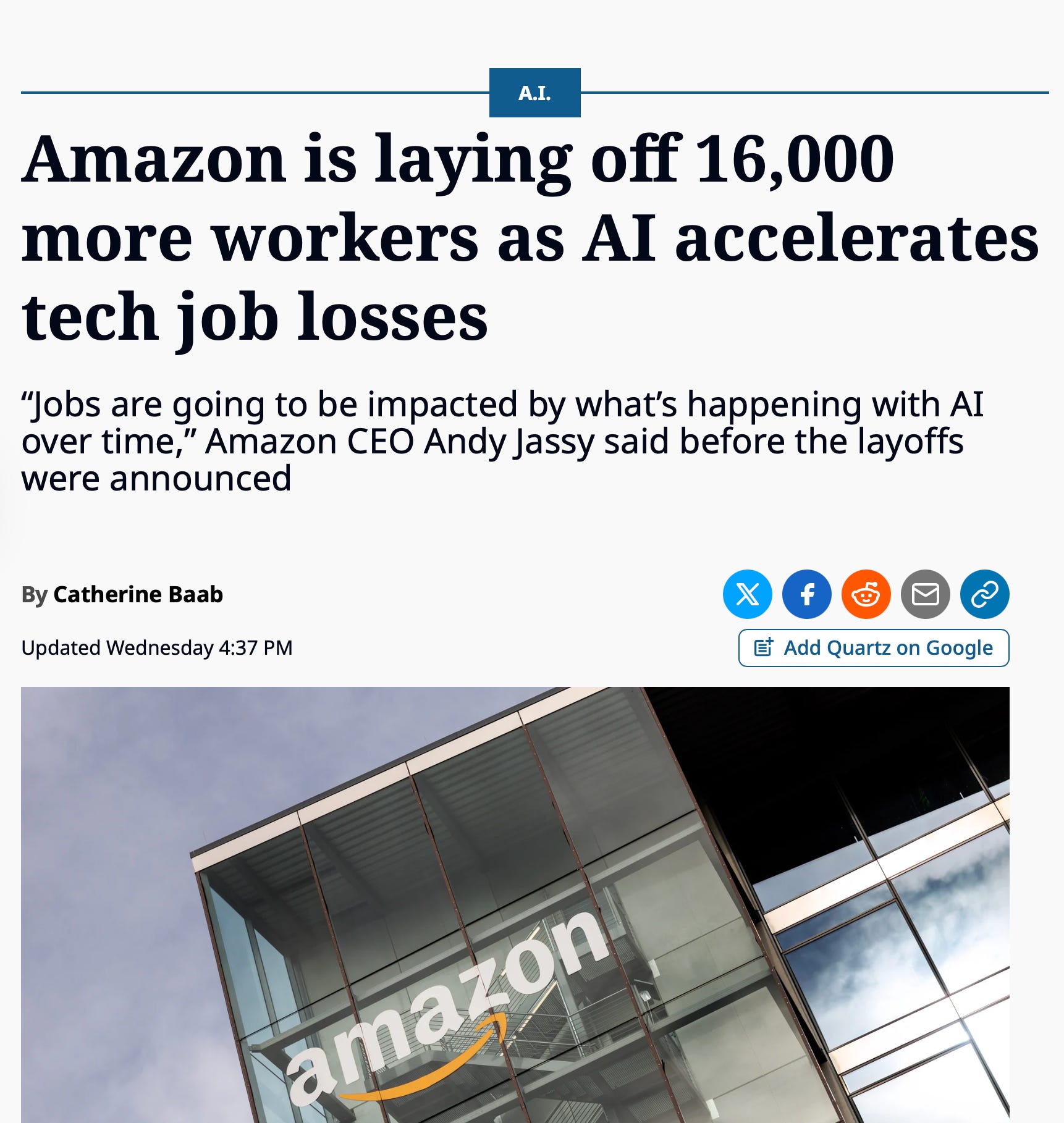 Proprio questa mattina mi è arrivata la newsletter di Cal Newport, un osservatore attento delle trasformazioni in atto, che riprende la notizia dei licenziamenti di Amazon (16.000) per proporre lo stesso dilemma: questi licenziamenti sono causati dall’AI o sono dovuti ad altre motivazioni, poi giustificati di fronte al pubblico con le dinamiche legate all’avvento dell’AI? Il titolo dell’articolo di Newport è emblematico: “The Dangers of “Vibe Reporting” about AI.”