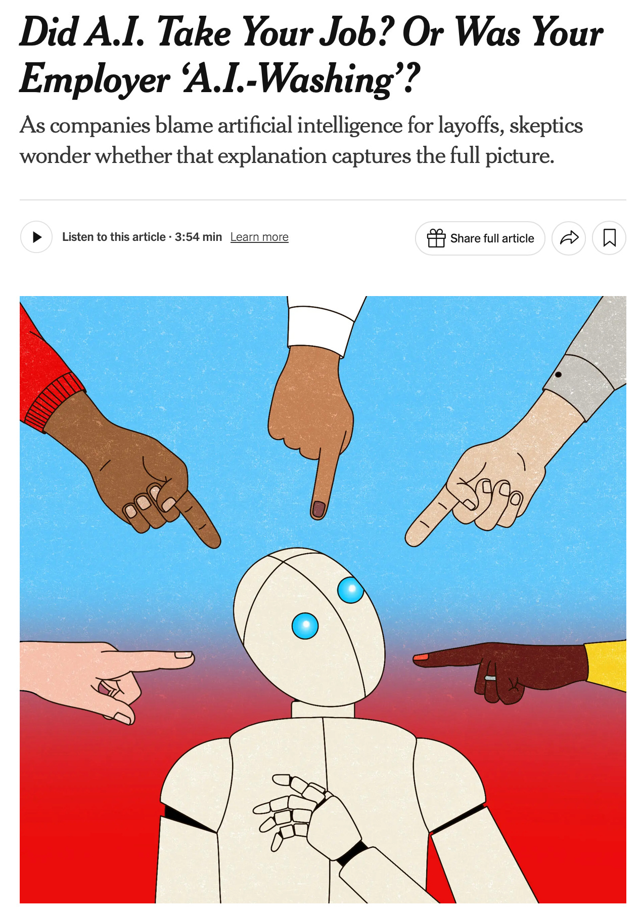 Un articolo del NYT del 1 febbraio riprende un tema delicato già emerso in altre occasioni: notizie che vengono associate a fenomeni di moda per ottenere un'ampia audience o per mascherare altre dinamiche. È l’AI-washing, che ricorda ciò che già abbiamo visto con il greenwashing: