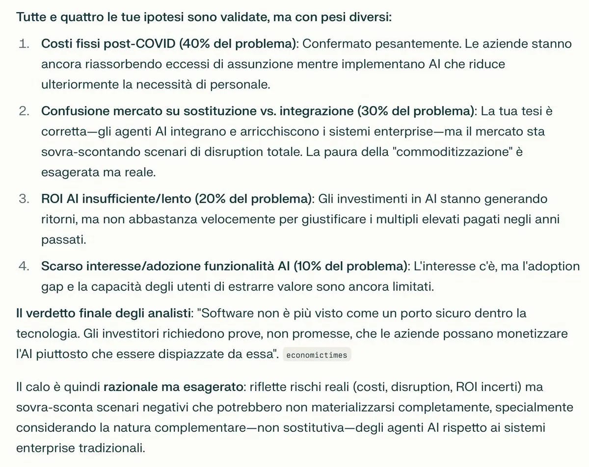 Sul drop del mercato SaaS, i nostri analisti di Bain condividono un paio di altre idee oltre a quelle riportate da Perplexity. Uno dei punti forti della loro analisi é il potere negoziale che AI offre ai procurement offices nello stato del mercato attuale. Non importa (per ora) se i claim dei GenAI provider sono accurati o meno, se la percezione é che l'azienda può rimpiazzare il prodotto SaaS con qualche licenza di ChatGPT, al rinnovo non solo non accetterà il tipico aumento del prezzo del 5-8%, ma anzi cercherà di ridurre i costi. L'altro angolo negoziale é che con tanti dei servizi MCP messi a disposizione dei SaaS vendor, poche decine di licenze saranno sufficienti a costruire una AI experience che serve 100+ utenti, rompendo il modello di business basato sul numero di "seats". Questa seconda considerazione la vedo meno rilevante, perché già stiamo vedendo vendor prezzare MCP a volume, API a consumo, cercando di mettere una pezza al problema / workaround.