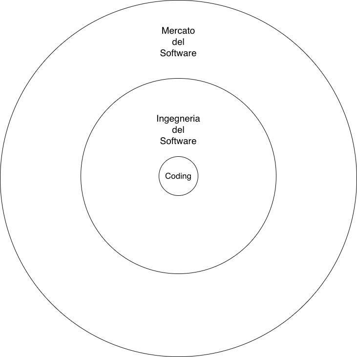 La figura che segue non ha un significato tecnico. Vuol semplicemente far capire che il codice, l’attività di coding, è solo una parte del processo di ingegneria del software, che a sua volta non esaurisce ciò che un’azienda produttrice di software deve fare per restare in gioco sul mercato.
