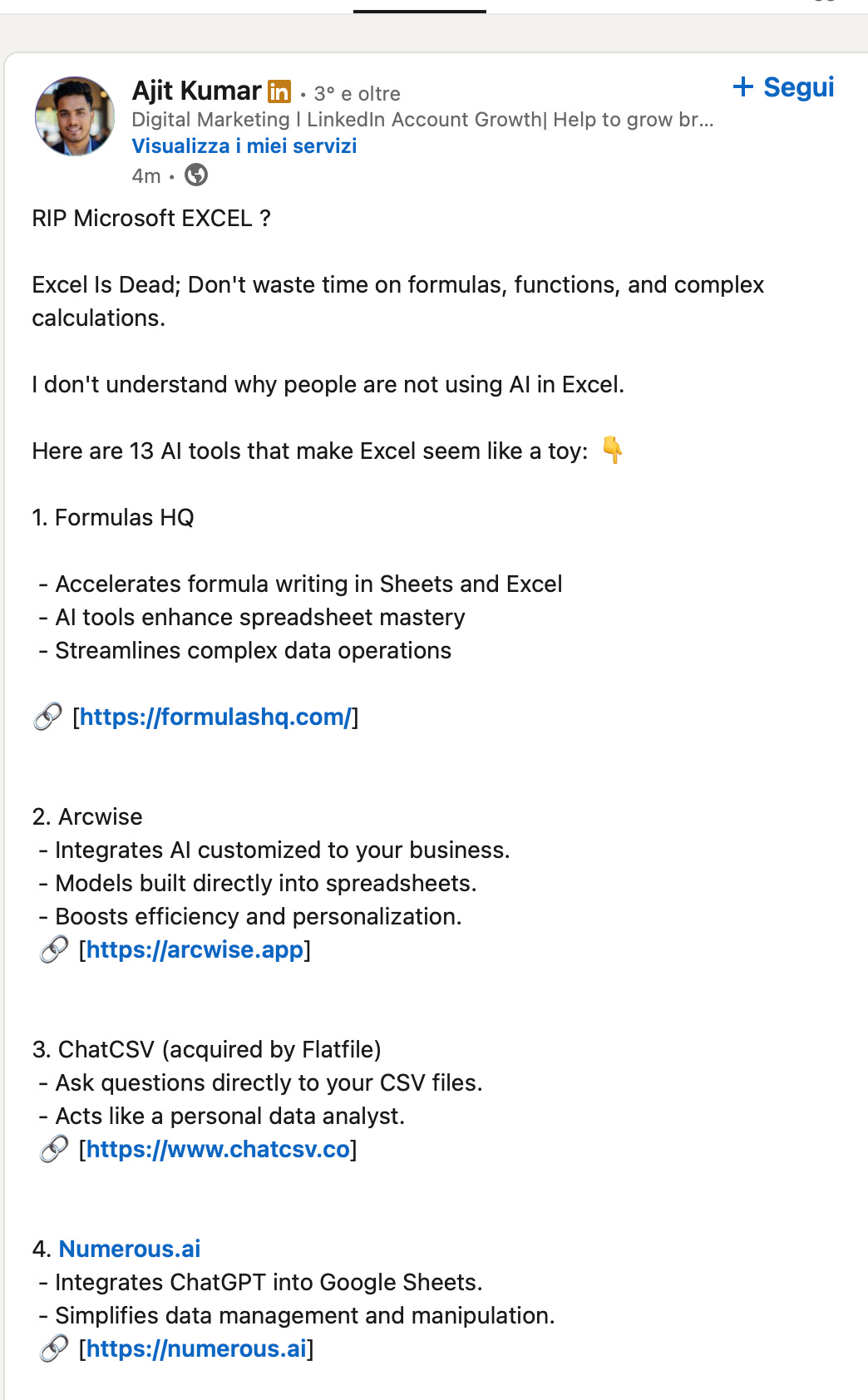 Quando ero in Cefriel eliminammo Excel non perché c’era GenAi, ma perché sostituimmo tutti i fogli Excel con basi di dati condivise e PowerBI. Certamente, in PowerBI adesso ha senso usare anche GenAI per migliorare la capacità di analisi, ma non è certo stata GenAI il driver per “uccidere” Excel. Excel doveva morire per ben altri e strutturali motivi: eliminare fonti informative estemporanee e destrutturate, eliminare ridondanza e replicazioni di dati e elaborazioni, eliminare incertezze sull’interpretazione delle informazioni (“Questo spreadsheet è l’ultima versione? È il tuo o il mio?”). Molte “rivoluzioni annunciate” servono ad usare ancor di più Excel, come implicitamente evidenziano alcuni passaggi del post LinkedIn che citavo poco fa: sono strumenti che automatizzano la creazione di un foglio Excel o lo arricchiscono. “I don’t understand why people are not using AI in Excel”. Altro che RIP Excel.