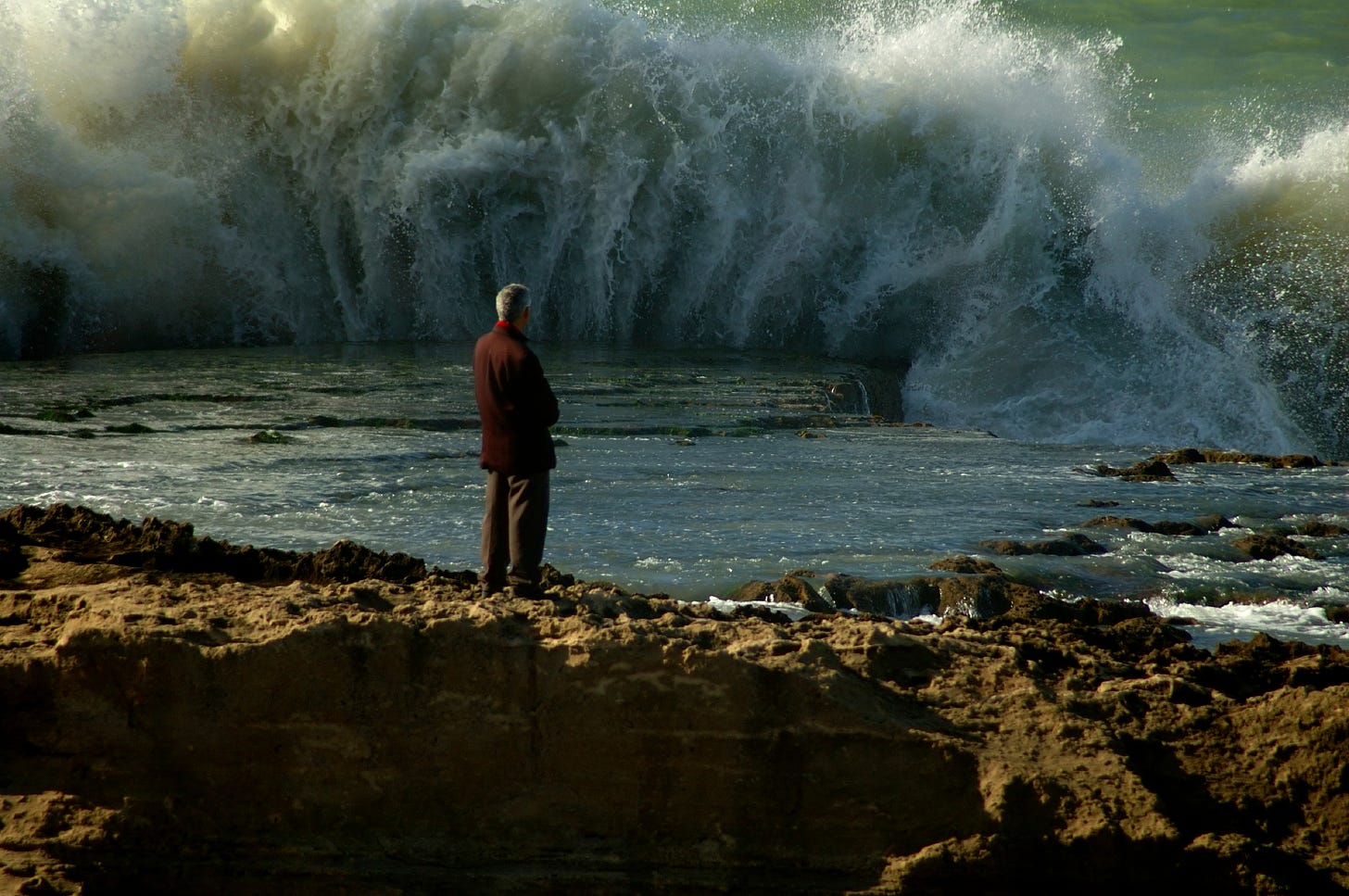 L’effetto del teleobiettivo schiaccia la scena, ma a me è sempre parsa emblematica: una persona che guarda un’onda che arriva e che rimane tranquilla e serena, illusa che non sarà colpito o che sarà in grado di “saltare” ed evitarla. Per quella persona l’onda non c’è o non la riguarda. E invece l’onda arriva e aver chiuso gli occhi e la mente provocherà l’inevitabile e spesso tragico danno.